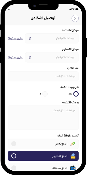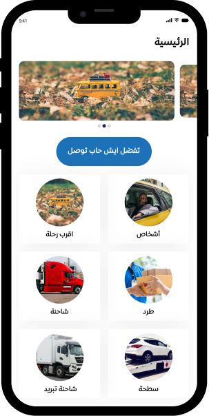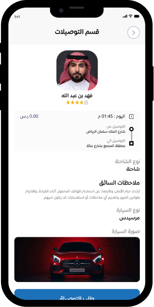 اختر نوع الخدمة (توصيل أشخاص، طرود، أو سطحة) واملأ نموذج الطلب بالمعلومات المطلوبة.